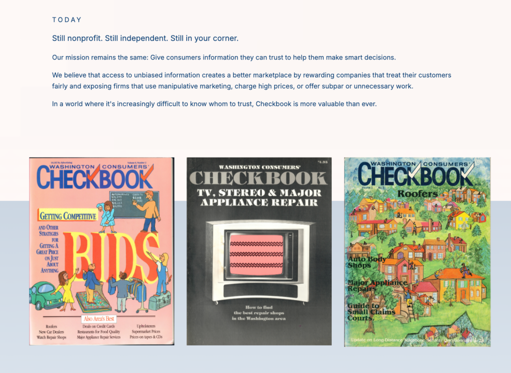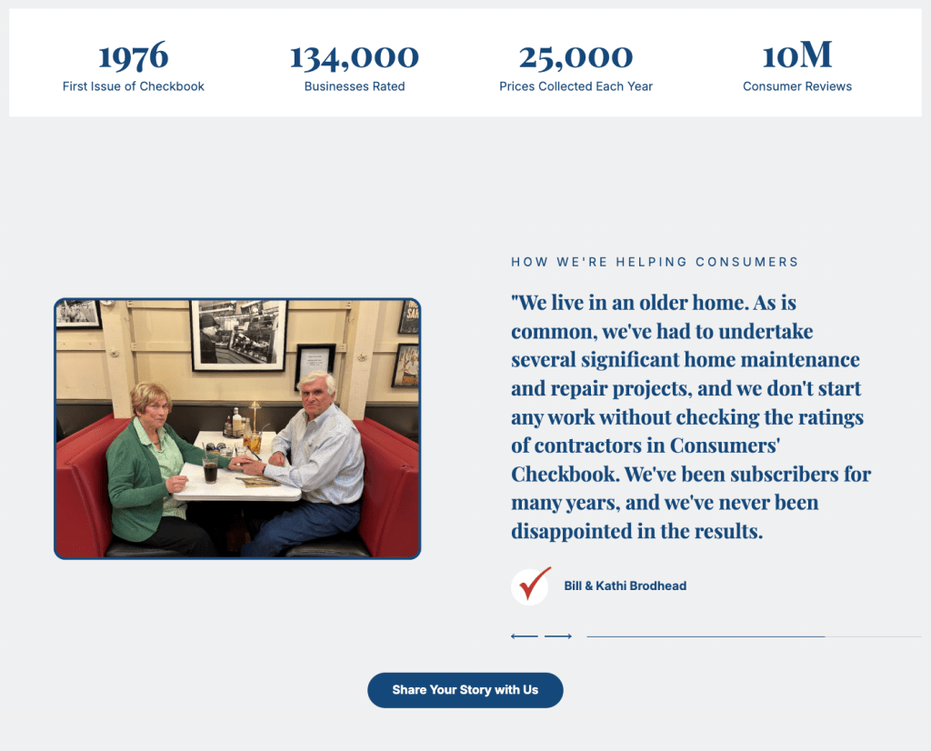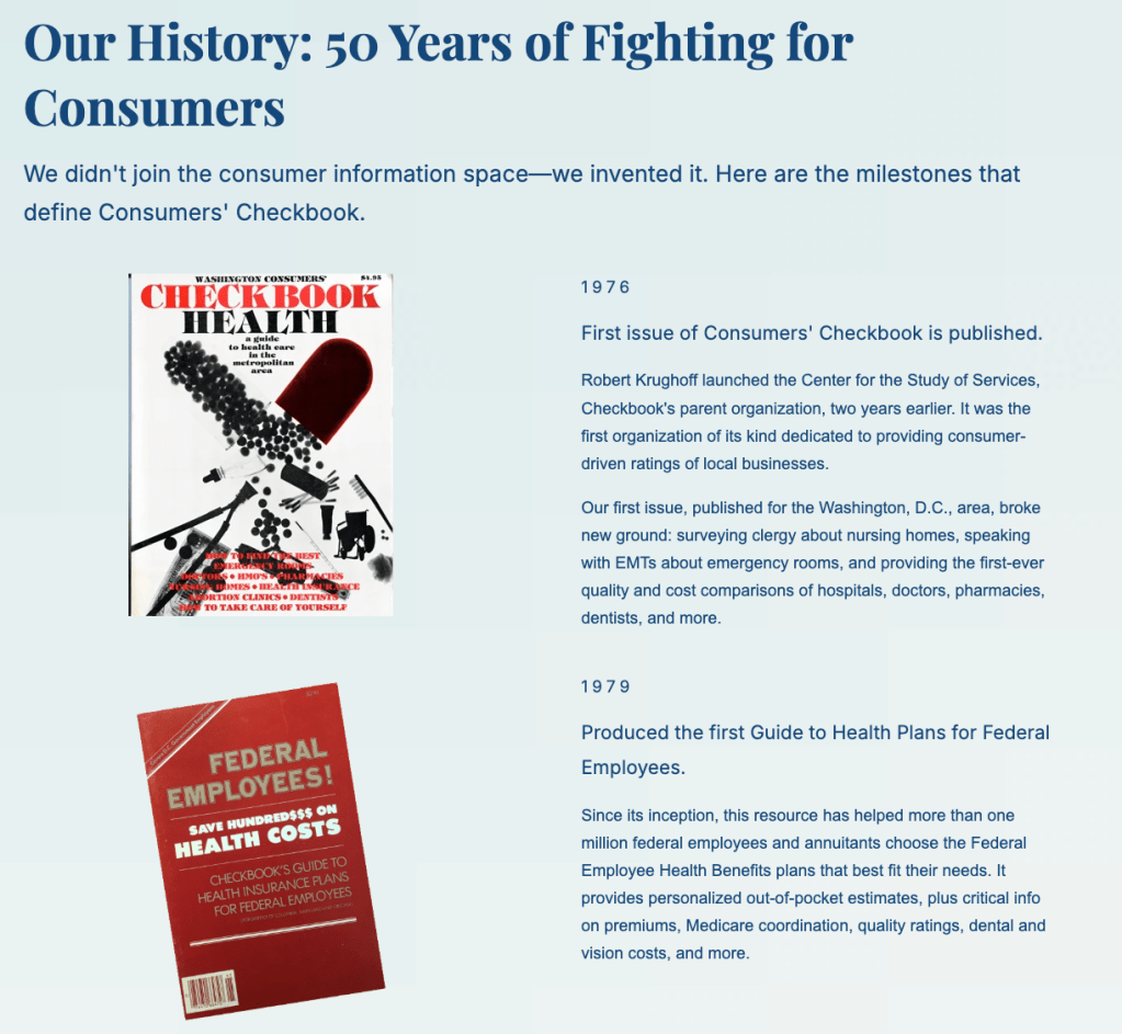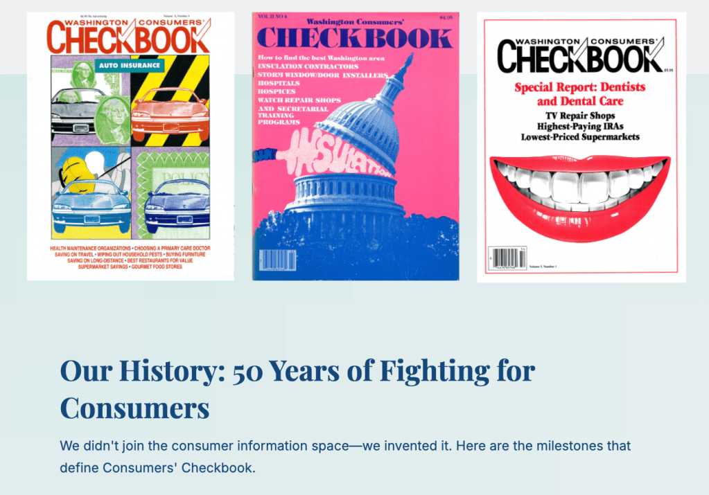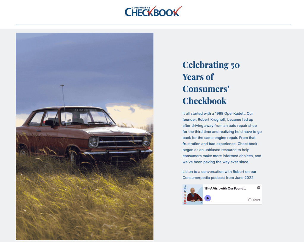 Landing page created to celebrate Consumers’ Checkbook’s 50th anniversary, highlighting the organization’s history, milestones, member stories, and archives, and share opportunities to support future work.