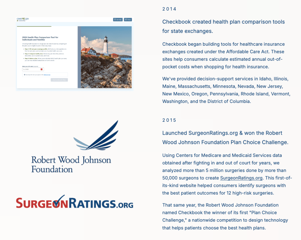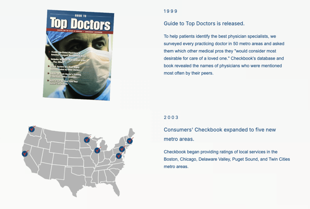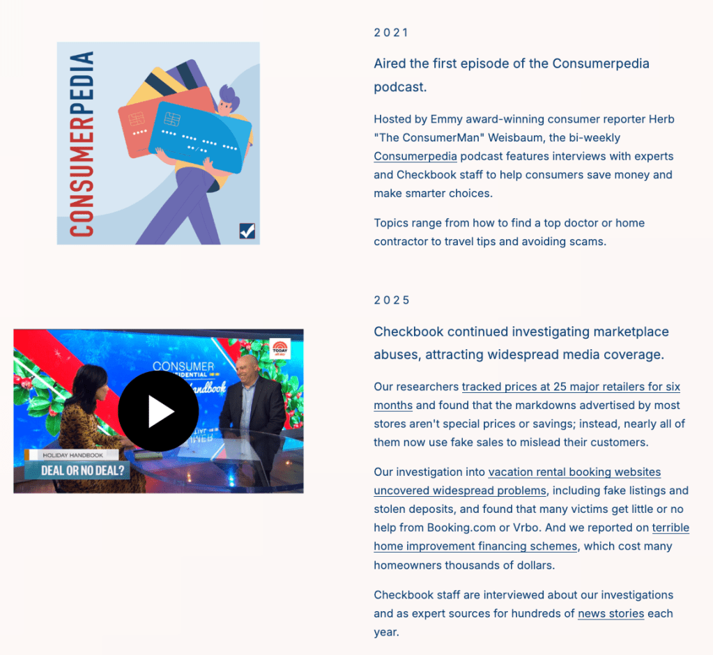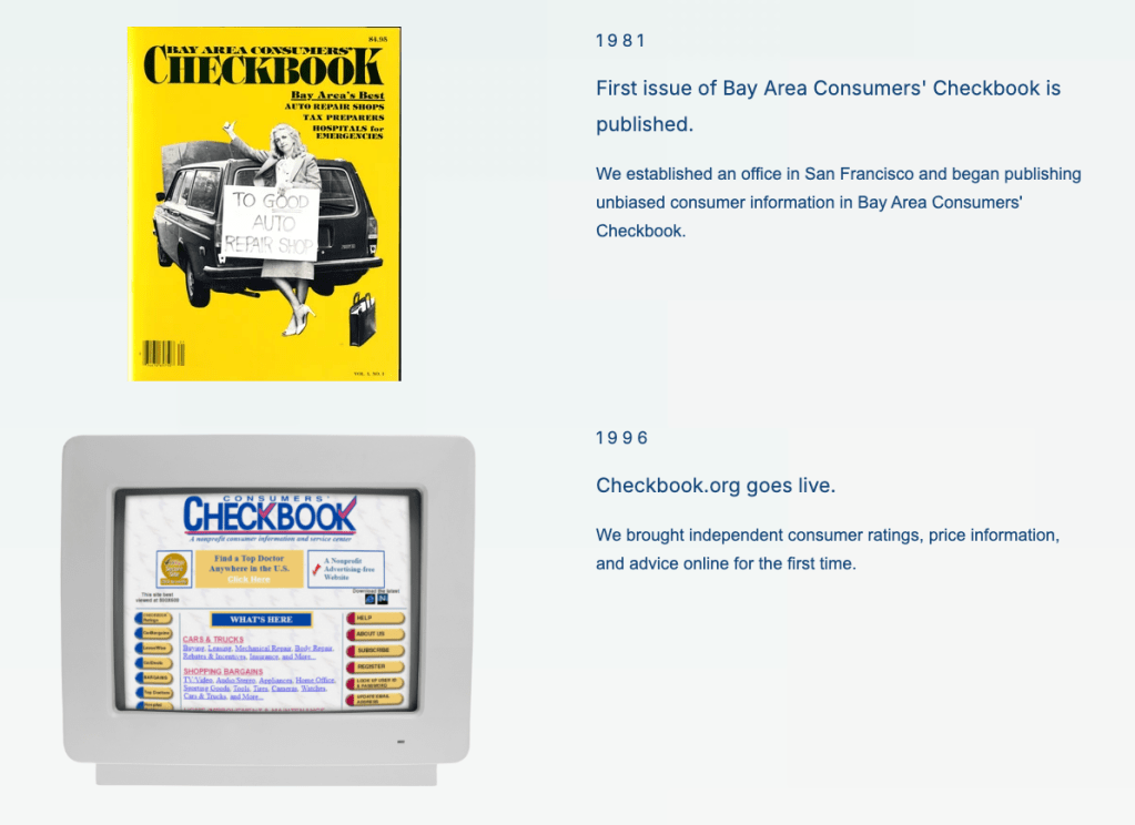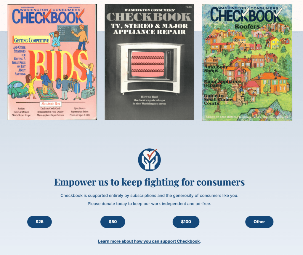 Landing page created to celebrate Consumers’ Checkbook’s 50th anniversary, highlighting the organization’s history, milestones, member stories, and archives, and share opportunities to support future work.